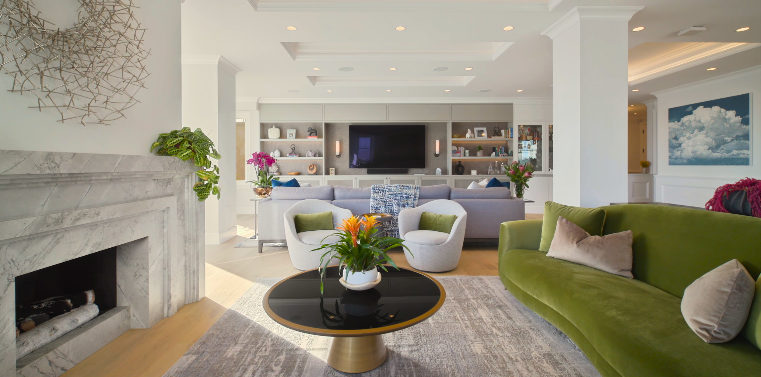 Nature is woven throughout the design through sculptural greenery, organic forms, and abundant natural light, creating a seamless dialogue between indoors and the surrounding city. Thoughtful material pairings and inviting furniture arrangements foster a sense of ease, resulting in an atmosphere that feels optimistic, welcoming, and quietly sophisticated.